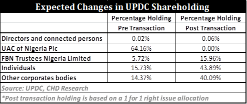 After the recapitalization of UPDC, the company will also unbundle its majority interest of 61.5 percent in the UPDC Real Estate Investment Trust (UPDC REIT) to UPDC shareholders through the allocation of REIT units directly to UPDC shareholders in proportion to their post rights issue holdings in UPDC. This will be in addition to their shares in UPDC.