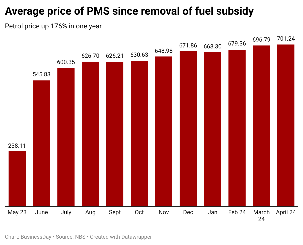 The average retail price paid by consumers for petrol in April 2024 was N701.24, indicating a 157.57 percent increase when compared to the value recorded in April 2023 (N254.06).