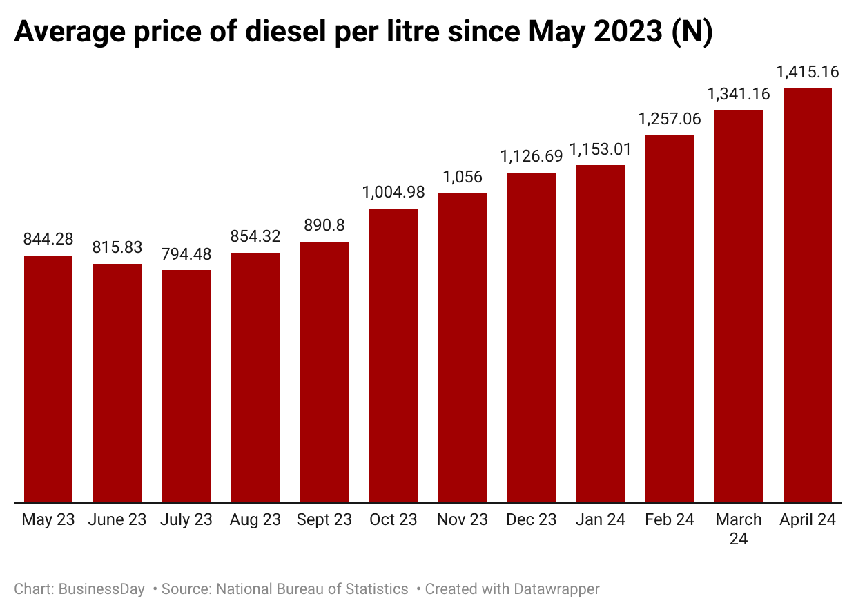 The average retail price of automotive gas oil (diesel) paid by consumers increased by 68.01 percent on a year-on-year basis to N1,415.06 per litre in April.