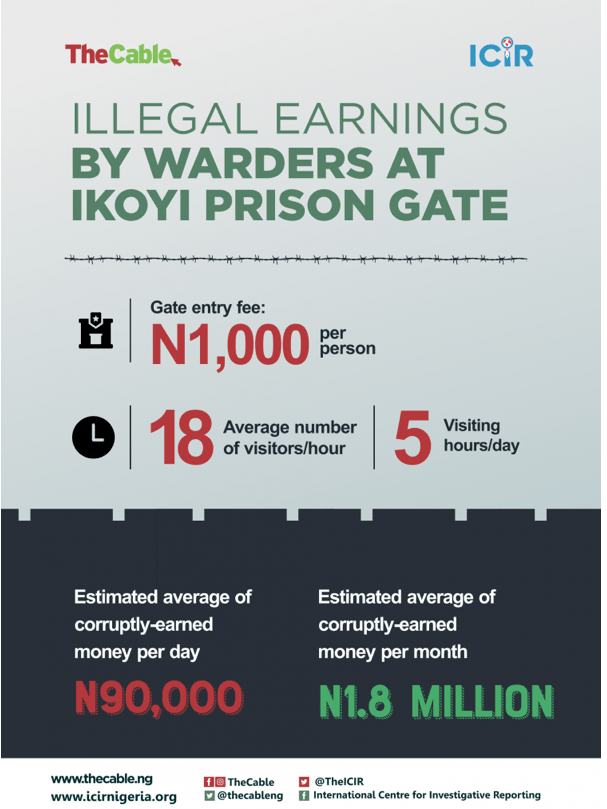 Rather, she was expressly asked to part with her money as a condition for access to me. On the surface, this looks a pittance, but not so when viewed in the context of the human traffic to the prison. On Saturday evening, I had managed to do a head count of visitors: 18 of them in an hour. Do the math! This Ikoyi-visit corruption has grown in leaps and bounds, evidently; back in 2016, a N200 bribe gave a visitor access to an inmate. Not anymore!