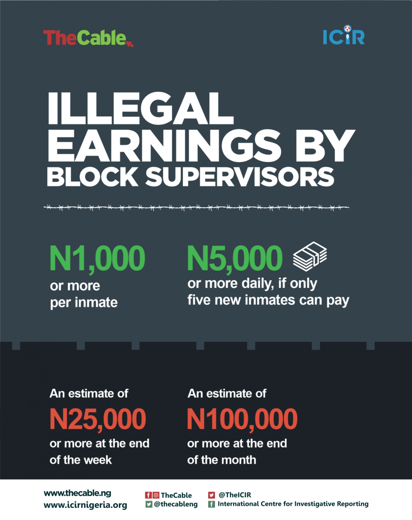 “You can get a cell for N30,000,” one of the warders tells me. “You can also get for N100,000 or N150,000. You can even get a N1.5million cell.”