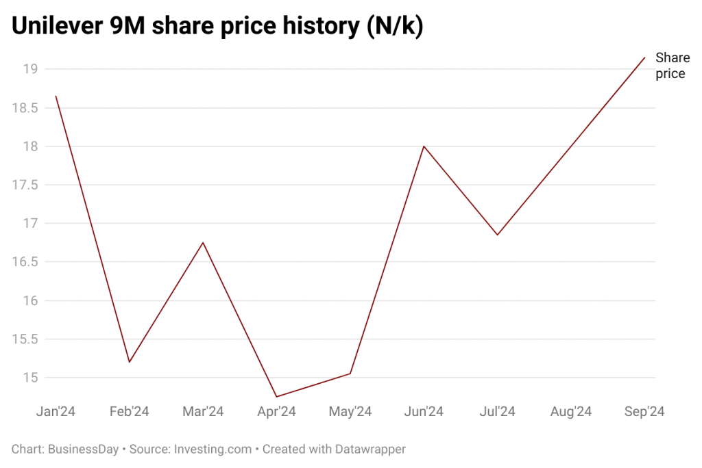 Between July and September 2024, Unilever appreciated by 6.3 percent, moving from N18.00 as of July 1 to N19.15 as of September 30. During the same period, there was immense buy pressure on Unilever shares, which surprised market observers.