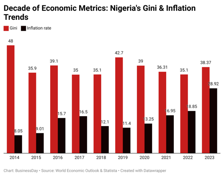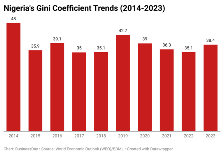 Nigeria’s Gini coefficient, a measure of income distribution within a population, has undergone significant fluctuations over the past decade. Starting at a high of 48 in 2014 and ending at 38.37 in 2023, according to BusinessDay projections, these numbers paint a vivid picture of the country’s socio-economic landscape. The Gini coefficient provides insight into the degree of inequality within a society, with higher values indicating greater disparities in income distribution.