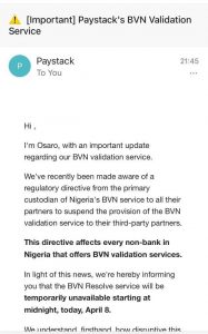 As a result of the suspension by NIBSS, Paystack said in a note to a customer that its BVN Resolve service will be temporarily unavailable starting from midnight of April 8.