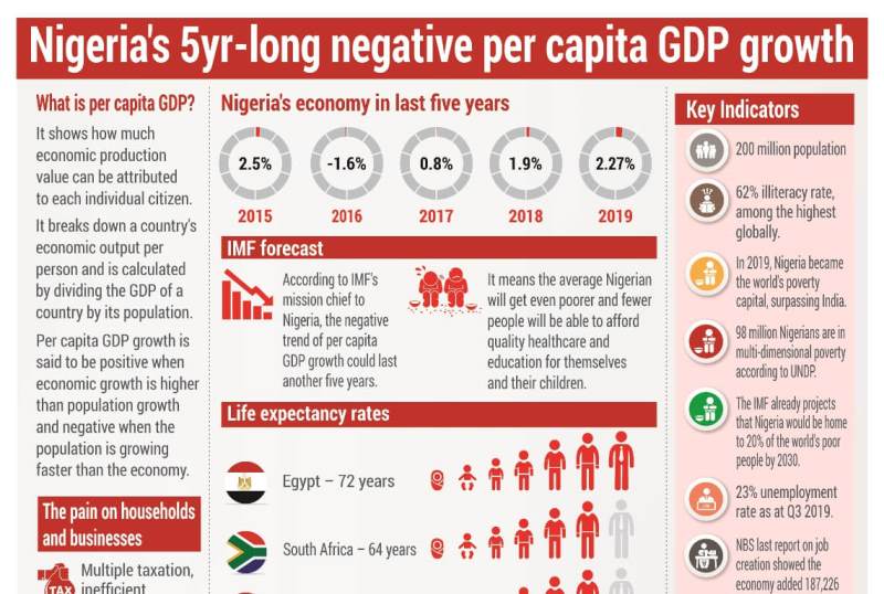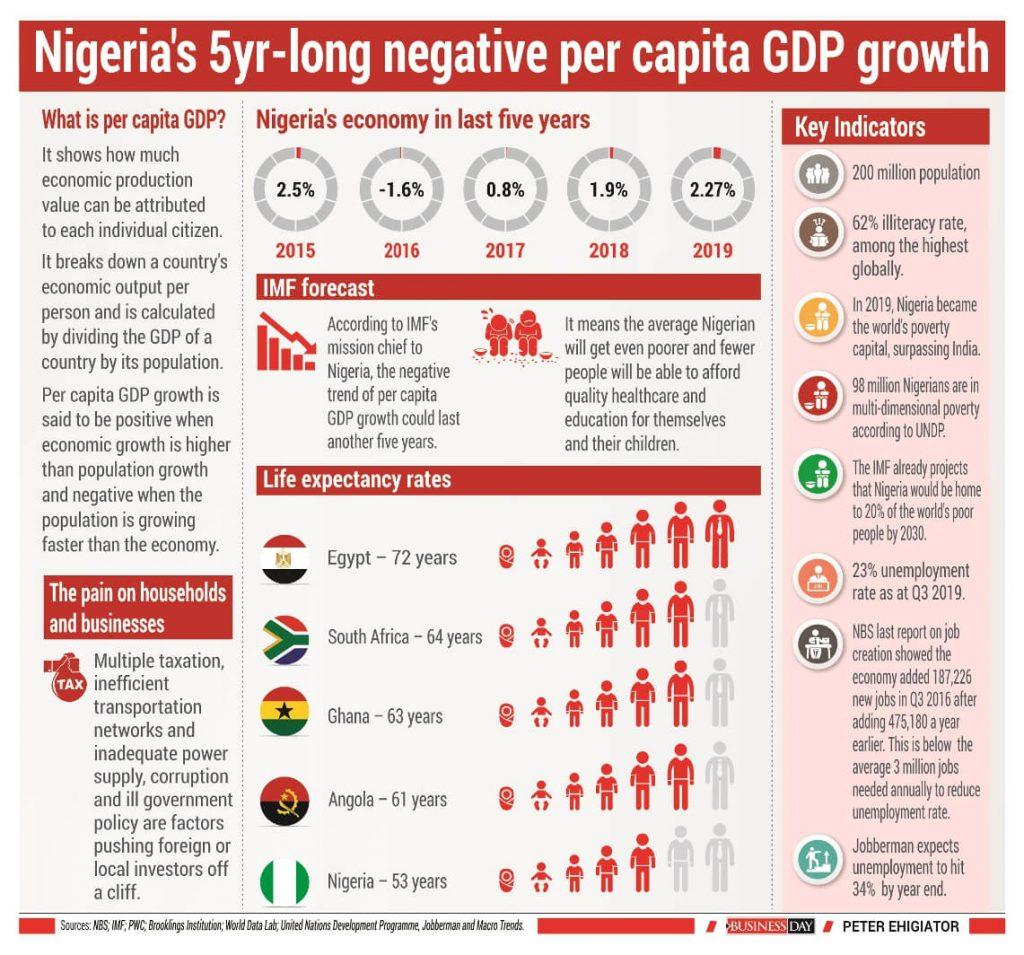 Nigeria’s relatively low Per Capita GDP, which paints a dim picture of the living standards in the country, has been worsened by five straight years of contraction.
