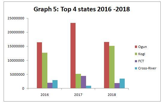 Kogi state is another top performer in terms of solid mineral production. Like Ogun in the South-west, it is the major anchor in the North-central. It recorded significant output growth between 2017 and 2018. It recorded an output growth of 189.45 percent between 2017 and 2018 contributing 27.1 percent of total national output in 2018. Other top performers include Cross-River and FCT with 6.25 percent and 3.4 percent respectively.