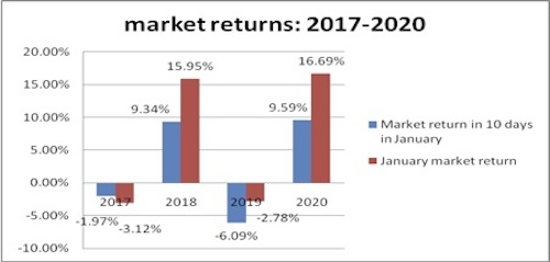 The first 10 days trading of 2020 appeared to be the inverse of the first 10 trading days of 2019, with the graphs of the market returns appearing like pincers curve, implying a trade-off between two periods. In 2019, returns of the first ten days of that year oscillated in the negative territory, but the negative trend of that period’s first ten days changed on the tenth day of the period which ended in the positive territory.