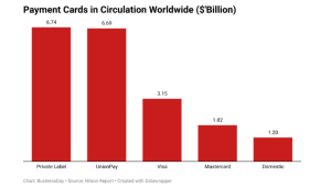 While Visa and Mastercard are the only network payment processors involved in all three areas of the payments market, working exclusively as network processors, research shows that Unionpay is covering a larger part of the market. UnionPay is the second most circulated payment card worldwide which shows the extent of its reach well above Visa and Mastercard.