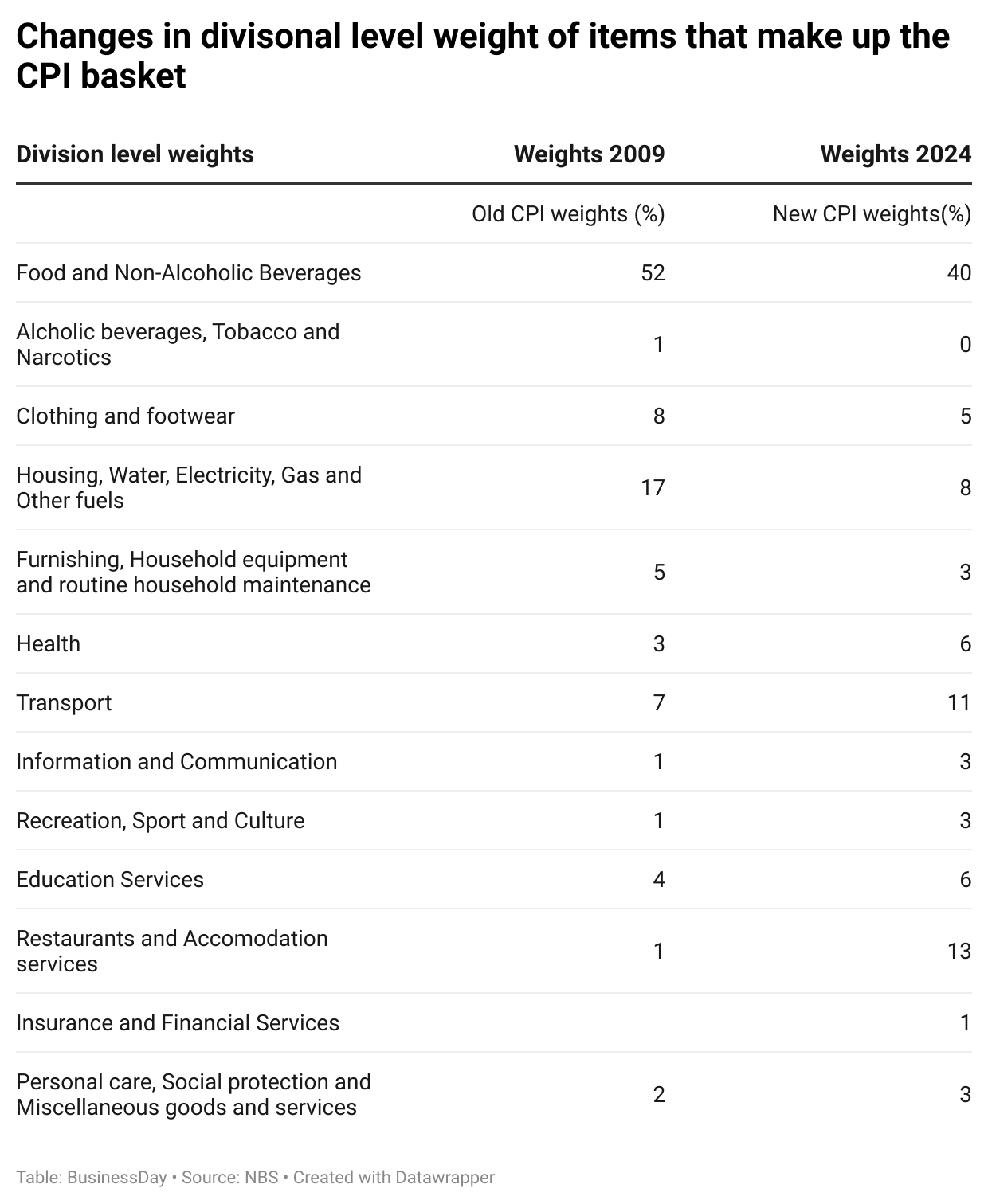 The divisional level weights of CPI have also adjusted from 12 to 13, with the addition of financial and insurance services. The percentage of existing weights were also adjusted to fit present-day realities.