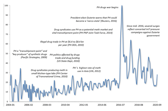 It was only after Duterte launched the war against the drugs that critics awoke, as Google Trend search evidences. Since 2016, there have been several surges, which reflect concerted, coordinated international pressure campaigns – but ones whose combined impact has progressively declined (Figure).