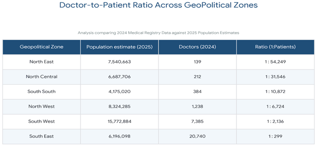 The consequences are most evident in human resources for health. As of 2025, the Nigerian Medical Association estimates a doctor-to-patient ratio of 1:3,500 to 1:5,000, compared with the World Health Organization’s recommended 1:600. This structural shortage is being exacerbated by accelerating medical migration. In 2024 alone, 4,193 doctors and dentists left the country, contributing to an estimated 200 percent surge in outward migration across health cadres.