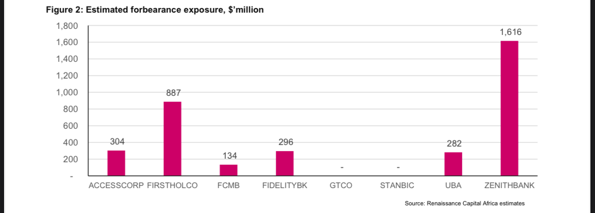 “We estimate regulatory forbearance exposures at $304 million, $887 million, $134 million, $296 million, $282 million, and $1.6 billion for ACCESSCORP, FIRSTHOLDCO, FCMB, FIDELITYBK, UBA, and ZENITHBANK, respectively,” the report shows.
