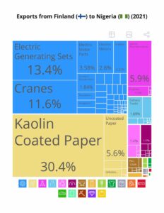 Finland-Nigeria In 2021, Finland exported $47.9M to Nigeria. The main products that Finland exported to Nigeria were Kaolin Coated Paper ($14.6M), Electric Generating Sets ($6.43M), and Cranes ($5.53M). During the last 26 years, the exports of Finland to Nigeria have increased at an annualised rate of 6.55%, from $9.2M in 1995 to $47.9M in 2021.