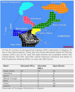 Nigeria has seven basins including the Niger Delta, Anambra, Benin, Benue Trough (Gongola), Bida, Chad and Sokoto Basins. Apart from the Niger Delta where extensive exploration and production is performed, there has only been minimal exploration in Benue Trough, Benin, Anambra and Chad basins.