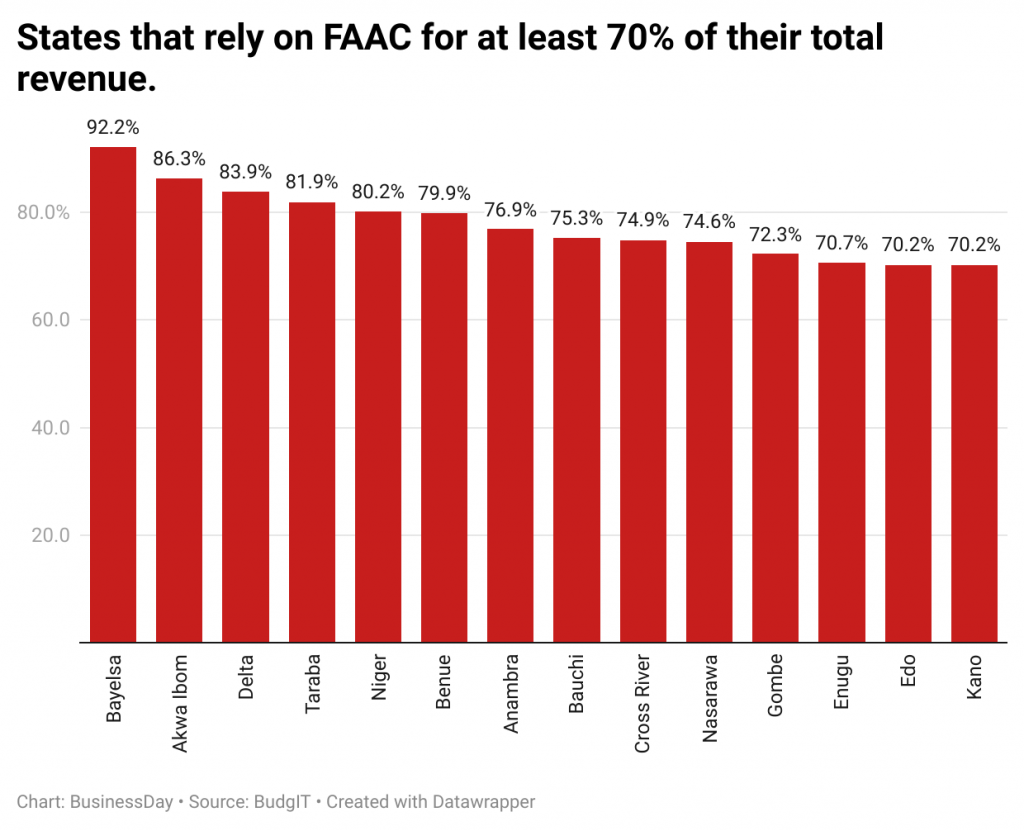A recent report by BudgIT paints a troubling picture: fourteen states would struggle if the Federal Account Allocation Committee (FAAC) ceased payments today. These states, which rely on FAAC for at least 70 percent of their revenue, would struggle to cover essential costs such as salaries, pensions, and gratuities.