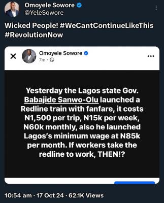 “Yesterday the Lagos state Gov. Babajide Sanwo-Olu launched a Redline train with fanfare, it costs N1,500 per trip, N15k per week, N60k monthly, also he launched Lagos’s minimum wage at N85k per month. If workers take the redline to work, THEN!?,” the activist said in a post on his X on Thursday.