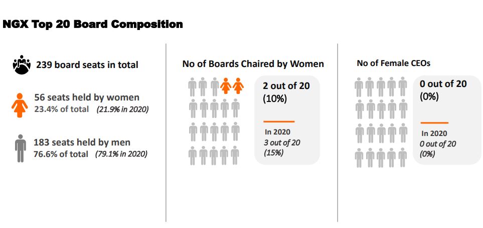 That growth is reflected as findings from the PWR NGX Top 20 Gender diversity scorecard indicates that the number of female board directors in the top 20 capitalised companies on the Nigerian Stock Exchange rose 2.5 percent in 2021.