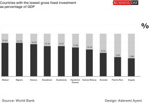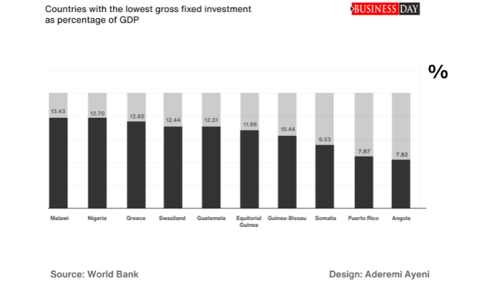 Investment as a percentage of GDP is below 15 percent but economists say the target should be atleast 20 percent for a country with such a large population.